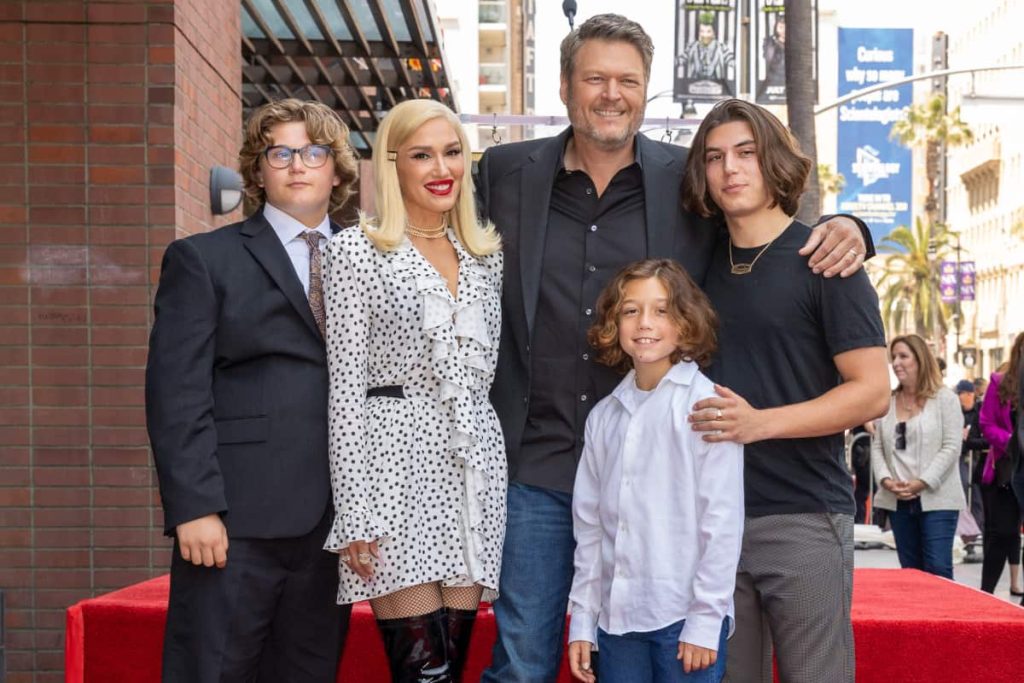 Gwen Stefani (kedua dari kiri) dan Blake Shelton (tengah), berpose bersama anak-anaknya: dari kiri Zuma Nesta Rock Rossdale, Apollo Bowie Flynn Rossdale dan Kingston Rossdale, pada upacara penganugerahan bintang Hollywood Walk of Fame untuk Blake, di Los Angeles, Jumat, 12 Mei , 2023. (Jordan Strauss/Invision/AP)
