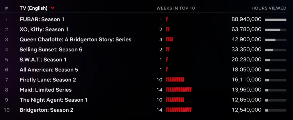 “Fubar” dari Arnold Schwarzenegger melakukan kudeta penuh aksi di puncak daftar TV Inggris Netflix selama periode penayangan 22-28 Mei, mengalahkan “Queen Charlotte: A Bridgerton Story” untuk posisi No. 1 setelah tayang selama tiga minggu. Komedi aksi, yang menandai serial TV pertama Schwarzenegger, dibuka dengan 88,94 juta jam penayangan dalam empat hari pertama ketersediaannya, menjadikannya judul yang paling banyak ditonton dalam periode ini.