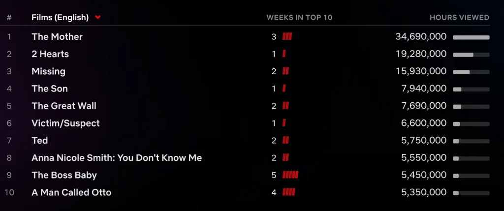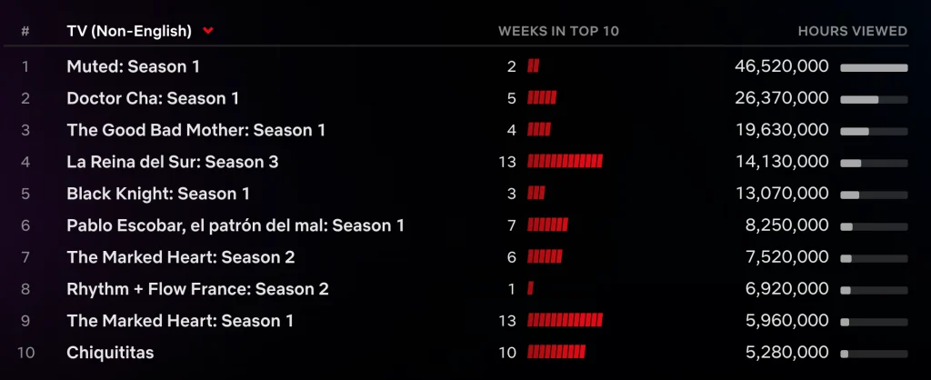 “Queen Charlotte” turun ke peringkat ketiga dengan 42,9 juta jam penayangan, yang masih merupakan kinerja yang solid meskipun terjadi penurunan signifikan dari minggu sebelumnya yang mencapai 82,39 juta jam penayangan. Sejak debutnya, serial ini telah ditonton lebih dari 66 juta kali dan berada di 10 besar di 91 negara. Netflix menghitung total penayangan dengan membagi total jam tayang (432,2 juta) dengan jam tayang (6,49 jam). Musim ke-2 “Bridgerton” juga tetap berada di daftar di posisi ke-10 dengan 12,54 juta jam penayangan.