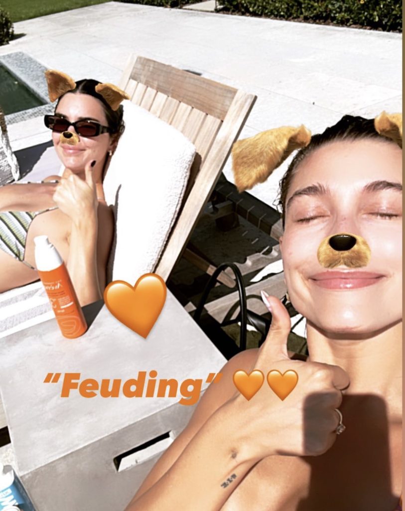 Akhir pekan lalu, Hailey mengunggah foto dirinya dan Kendall yang sedang berjemur di bawah sinar matahari bersama. Keduanya tersenyum dan mengacungkan jempol ke kamera saat pendiri perawatan kulit Rhode ini dengan bercanda menulis “berseteru” dan menambahkan serangkaian emoji hati.