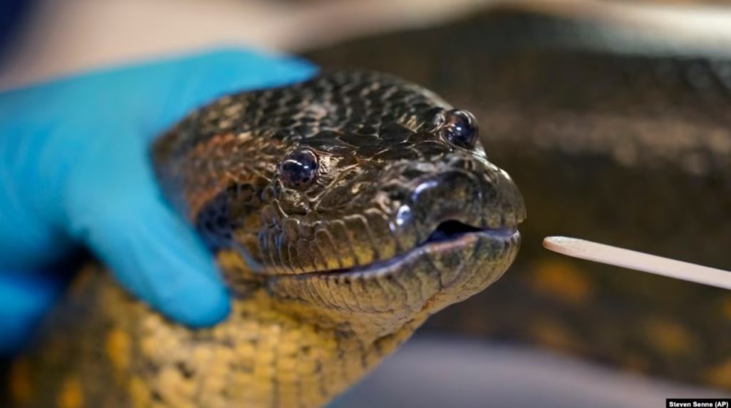 FILE – Seekor ular anakonda betina berusia 13 tahun bernama “Wilson” saat diiperiksa giginya di akuarium Boston, Mass., 27 April 2021.