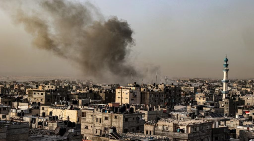 Asap mengepul di atas bangunan di kota Rafah, Jalur Gaza selatan pada 27 Maret 2024, di tengah konflik yang sedang berlangsung antara Israel dan pejuang Palestina.