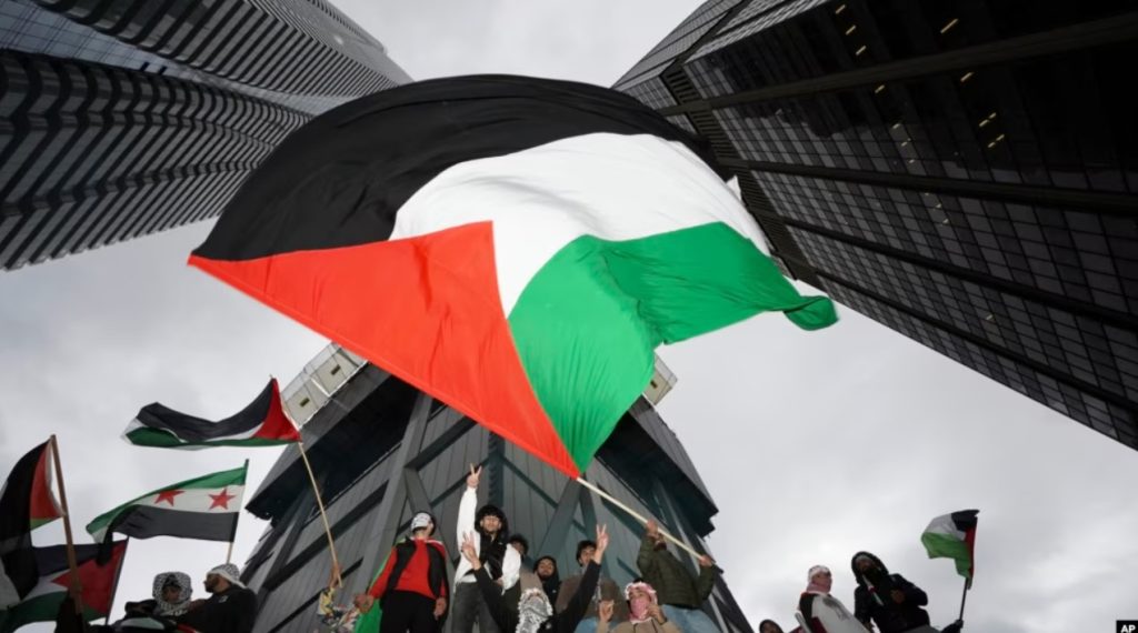 Para pendukung mengibarkan bendera Palestina dalam sebuah mars di Toronto, pada 9 Oktober 2023. (Foto: via AP)