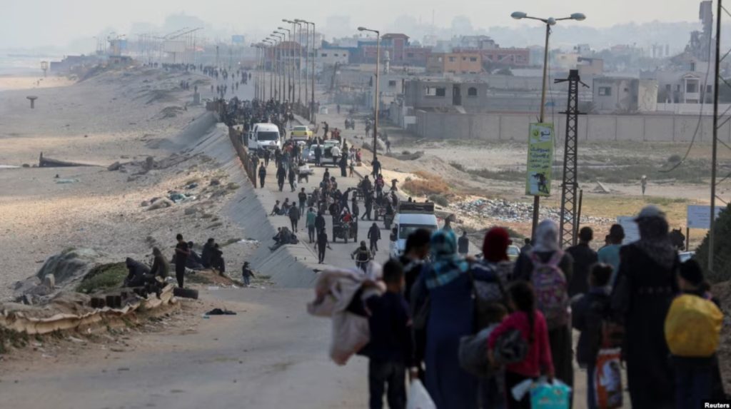 FILE – Warga Palestina, yang mengungsi akibat serangan militer Israel di Gaza selatan, berusaha untuk kembali ke rumah mereka di Gaza utara melalui pos pemeriksaan Israel, seperti yang terlihat dari Jalur Gaza tengah, 15 April 2024.