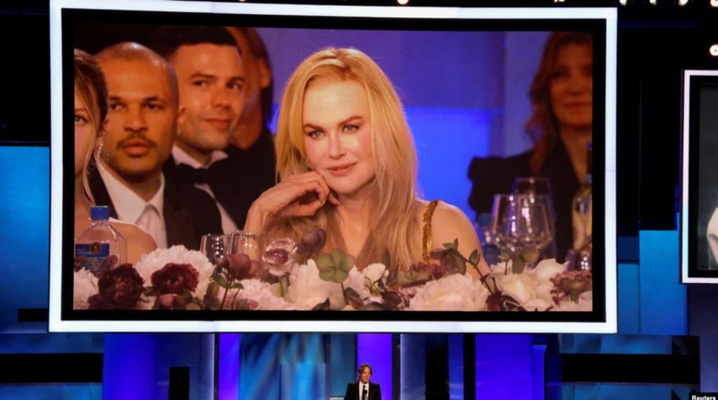 Reaksi Nicole Kidman (di layar TV) ketika suaminya, Keith Urban, memberi pidato saat acara pemberian penghargaan AFI Life Achievement Award di Los Angeles, California, Sabtu, 27 April 2024. (Foto: Mario Anzuoni/Reuters)
