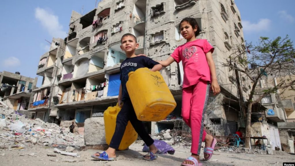 Anak-anak Palestina berjalan melewati sebuah bangunan yang rusak akibat serangan Israel, di tengah konflik yang sedang berlangsung antara Israel dan Hamas, di Rafah, di selatan Jalur Gaza, 1 Mei 2024. (Foto: Reuters)