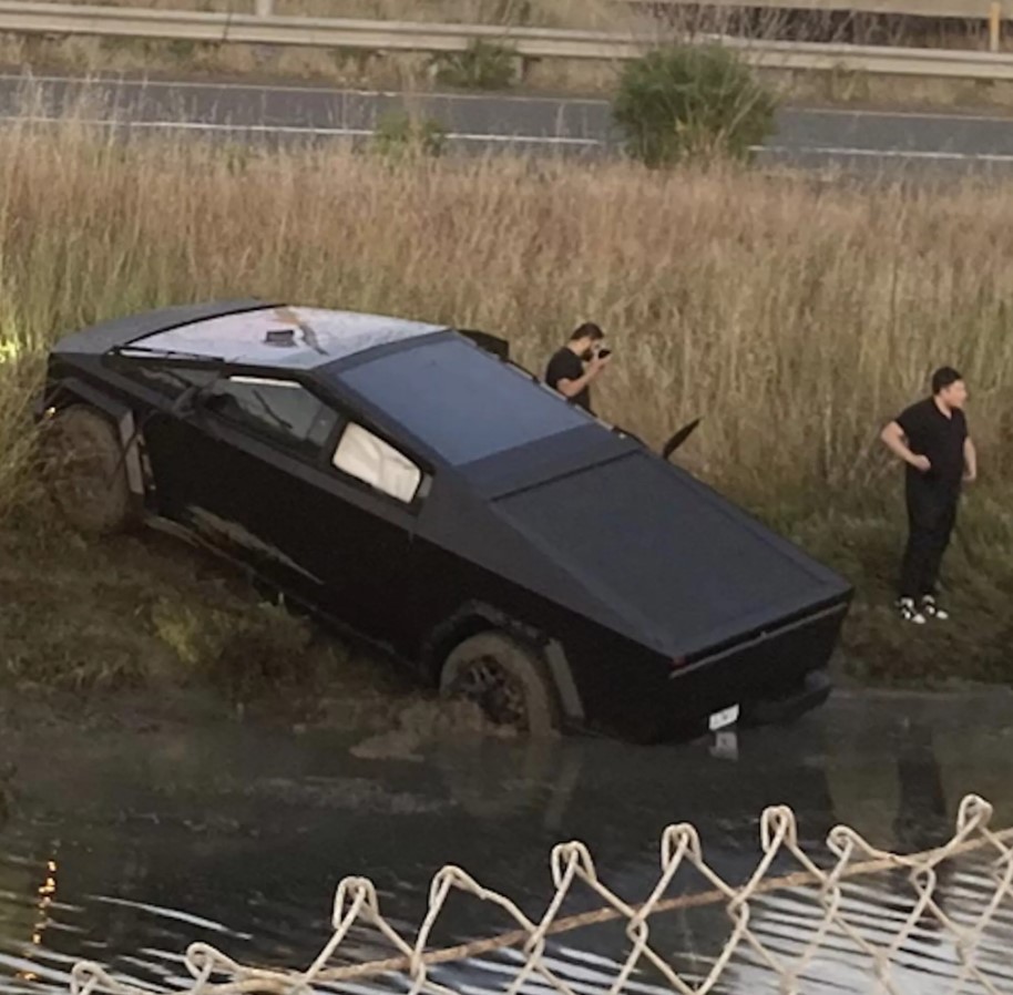 Teman muda, sebuah Tesla Cybertruck dilaporkan menabrak selokan, dan menyebabkan panel bodi sisi penumpang terkelupas. Kerusakan yang dramatis mungkin berkaitan dengan panel bodi stainless steel yang kaku, yang cenderung tidak mudah hancur dibandingkan dengan bodi kendaraan biasa.