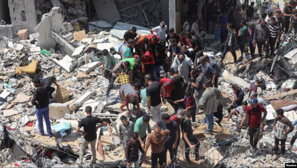 Warga Palestina mencari korban yang terperangkap di bawah reruntuhan rumah yang terkena serangan Israel di kamp pengungsi Nuseirat di Jalur Gaza tengah, 14 Mei 2024. (Foto: Reuters)