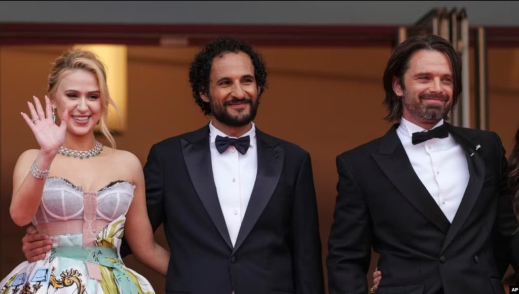Dari kiri ke kanan, aktris Maria Bakalova, sutradara Ali Abbasi, dan aktor Sebastian Stan berpose untuk para fotografer saat tiba di pemutaran perdana film,”The Apprentice” di Festival Film Cannes, di Prancis, pada 20 Mei 2024. (Foto: Scott A Garfitt/Invision/AP)