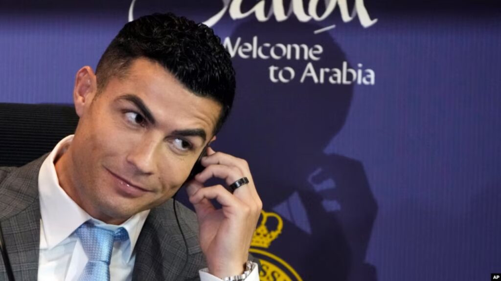 Bintang sepak bola Cristiano Ronaldo berbicara saat konferensi pers untuk perkenalan resminya sebagai anggota baru klub sepak bola Al Nassr di Riyadh, Arab Saudi, Selasa, 3 Januari 2023. (Foto: AP)