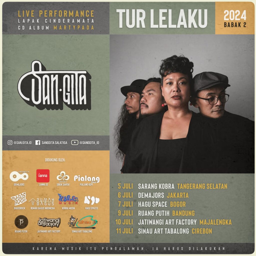 Berikut ini adalah jadwal dan venue Tur Lelaku 2024 – Babak 2 San.gita: 5 Juli, di Sarang Kobra, Ruko Pasar Kita, Pamulang, Tangerang Selatan 6 Juli, di Demajors, Pondok Labu, Jakarta 7 Juli, di Hagu Space, Babakan, Bogor 9 Juli, di Ruang Putih, Gegerkalong, Bandung 10 Juli, di Jatiwangi Art Factory, Majalengka 11 Juli, di Sinau Art Tabalong, Cirebon