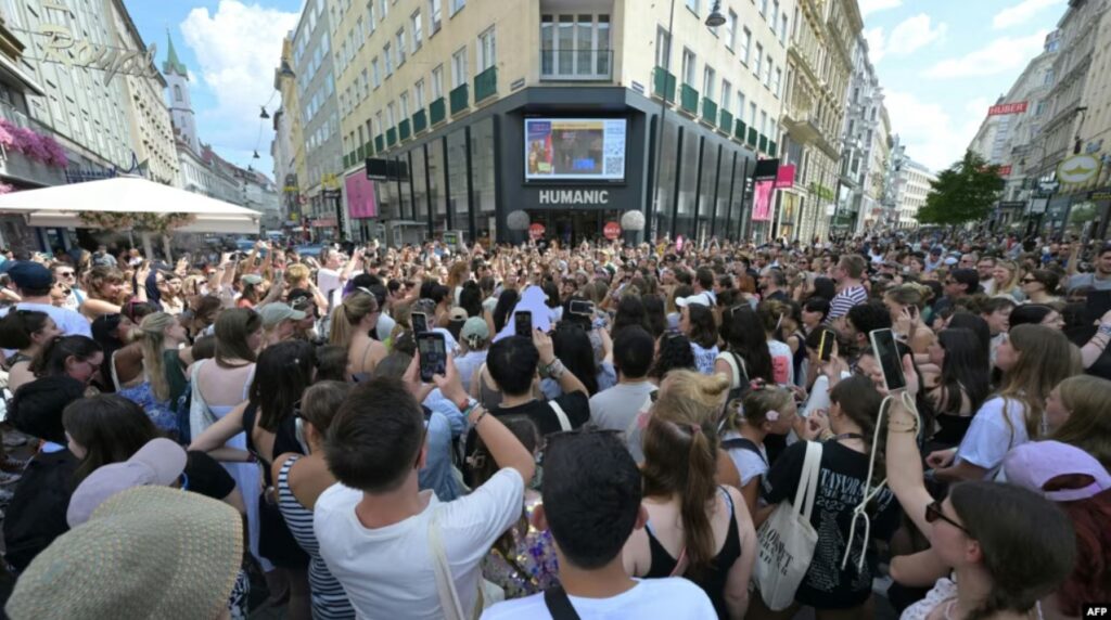 Ratusan penggemar Swift berkumpul di Corneliusgasse di Wina, tempat yang disukai para penggemar Swift karena kemiripannya dengan lagu hitnya “Cornelia Street”, dan menyanyikan lagu-lagu bintang pop itu.