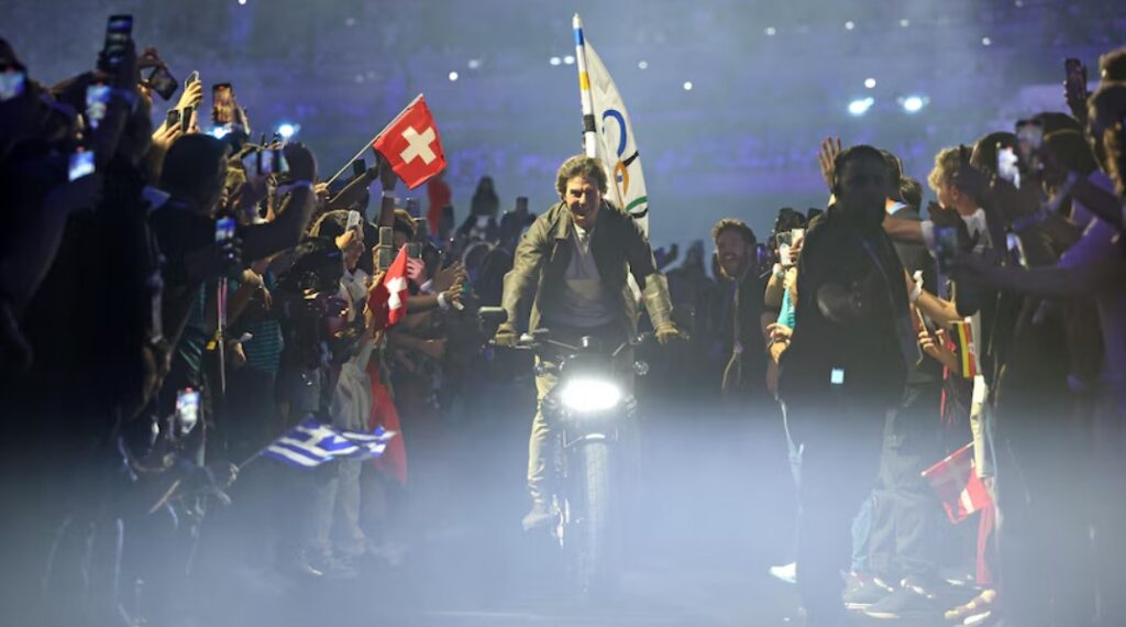 Artis musik pemenang berbagai penghargaan, H.E.R., menyanyikan lagu kebangsaan Amerika Serikat sebelum momen yang paling tidak terduga pada malam itu: Turunnya Tom Cruise dari atap Stade de France, yang mengingatkan kita pada adegan-adegan dalam film Mission Impossible.