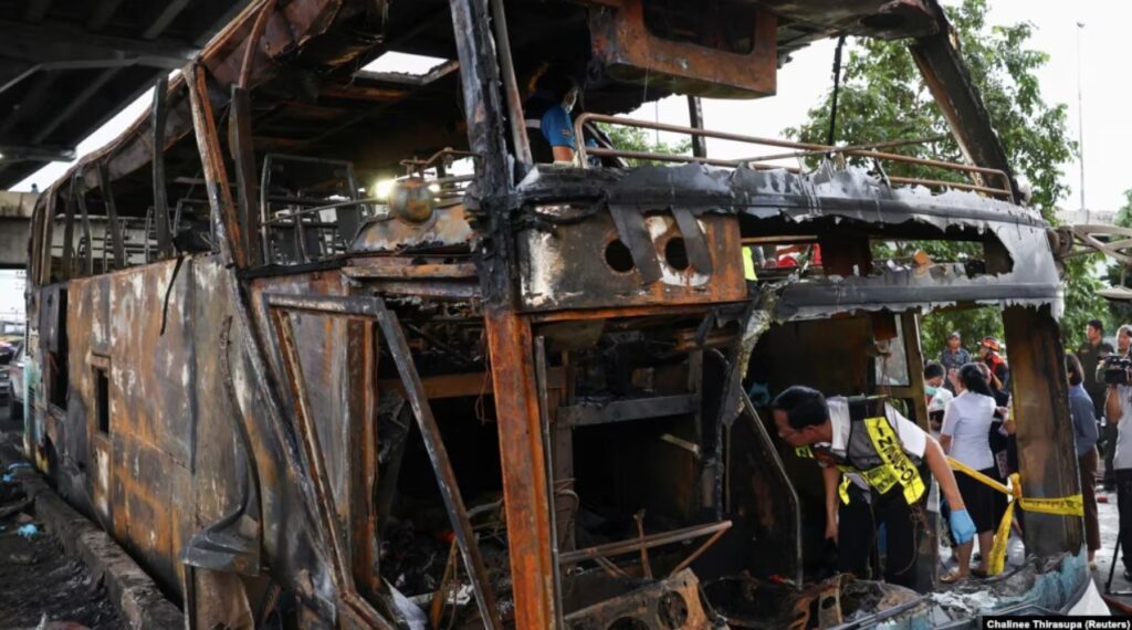 Bus yang membawa guru dan siswa dari sekolah Wat Khao Phraya, terbakar, yang mengakibatkan 25 orang tewas dan lainnya cedera, di pinggiran Bangkok, Thailand, 1 Oktober 2024. (Foto: Chalinee Thirasupa/REUTERS)
