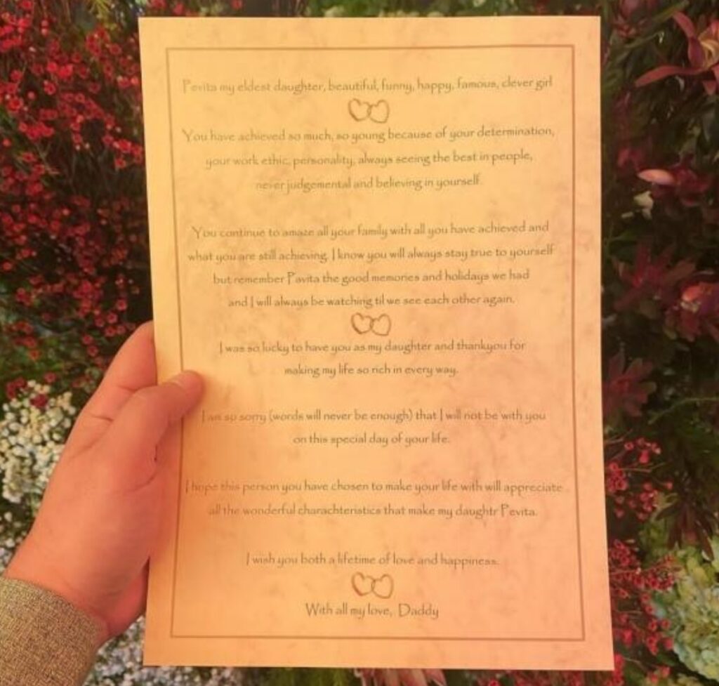 Surat itu berisi isi hati mendiang ayah Pevita Pearce yang sangat bangga memiliki putri seperti Pevita Pearce. Almarhum juga menyelipkan pesan yang bikin mewek semua yang hadir di momen pernikahan tersebut.