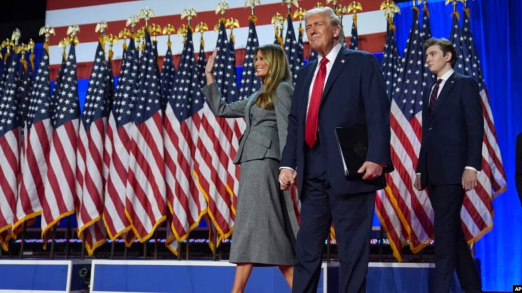 Capres yang diusung Partai Republik, mantan Presiden Donald Trump, Melania Trump, dan Barron Trump tiba untuk memberi sambutan pada malam nobar pemilu, di West Palm Beach, Florida, Rabu, 6 November 2024. (Foto: Evan Vucci/AP Photo)