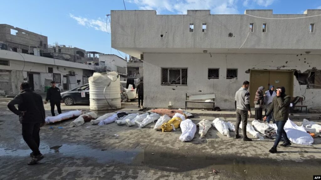 Mayat para korban tergeletak di halaman rumah sakit Kamal Adwan di Beit Lahya di Jalur Gaza utara, menyusul serangan Israel yang dilaporkan menghantam kompleks medis tersebut, 6 Desember 2024.