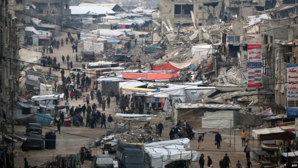 FILE – Orang-orang berjalan melewati kios-kios yang menjual barang di tengah reruntuhan bangunan yang hancur selama serangan Israel sebelumnya, di Khan Yunis di Jalur Gaza selatan, tanggal 15 Januari 2025.