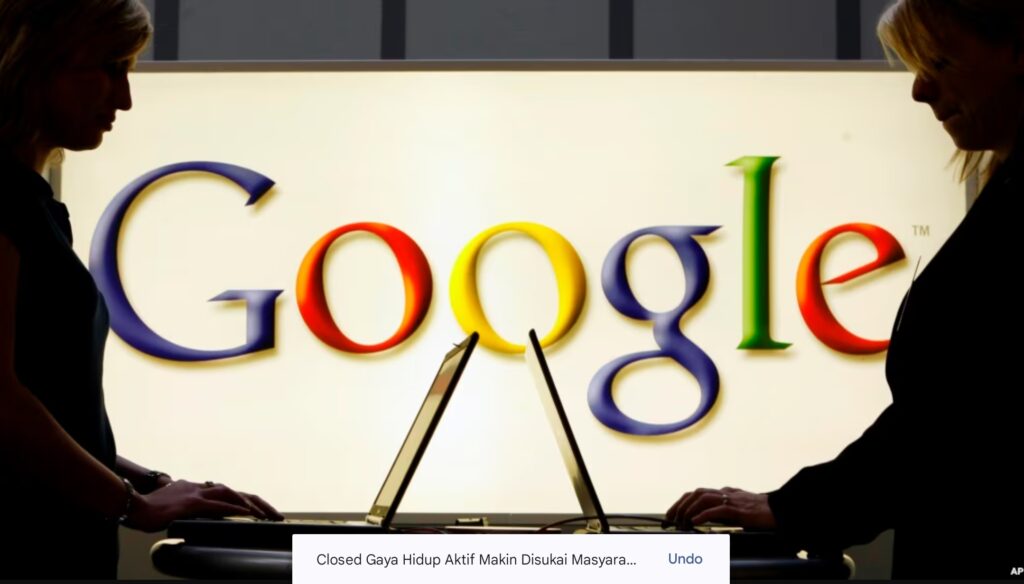 Dua pekerja sedang bekerja dengan latar logo Google di pameran industri Hannover Messe di Hannover, Jerman, 17 April 2007. (Foto: Jens Meyer/AP Photo/arsip)
