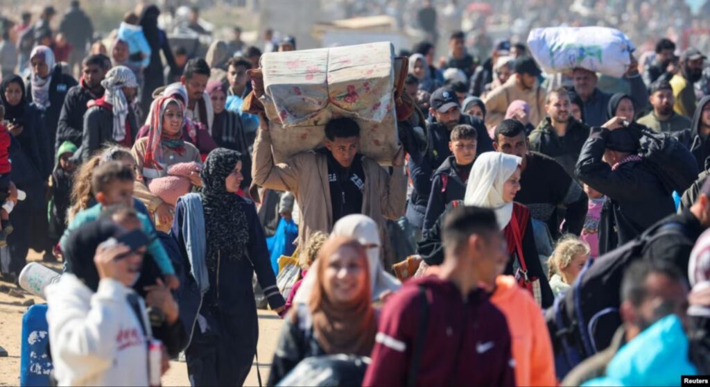 Warga Palestina, yang mengungsi ke selatan atas perintah Israel selama perang, kembali ke rumah mereka di Gaza utara, di tengah gencatan senjata antara Israel dan Hamas, di Jalur Gaza tengah, 27 Januari 2025. (Foto: REUTERS/Ramadan Abed)