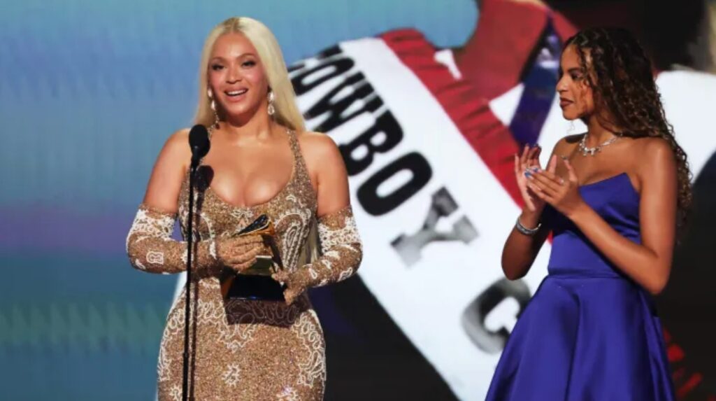 Beyonce menerima penghargaan Album Terbaik Tahun Ini untuk ‘Cowboy Carter’ bersama Blue Ivy Carter di atas panggung Grammy (Kevin Winter/Getty Images for The Recording Academy)