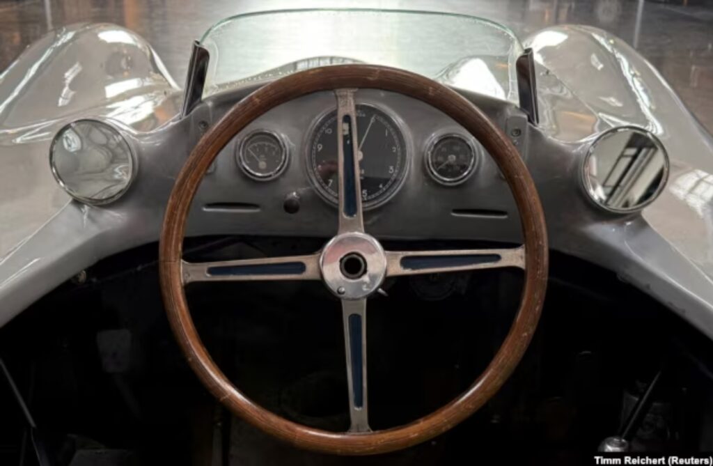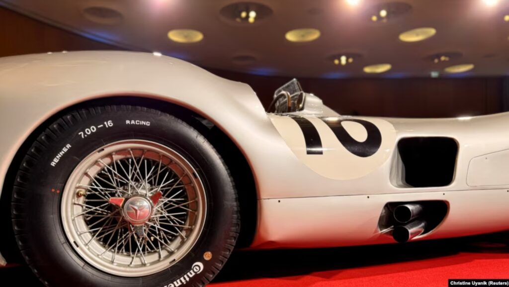 Mobil Mercedes yang dikendarai oleh pembalap legendaris Stirling Moss dan Juan Manuel Fangio pada 1955 memecahkan rekor mobil grand prix, terjual seharga 51,155 juta euro dalam lelang di Jerman, 1 Februari 2025. (Foto: REUTERS/Christine Uyanik)