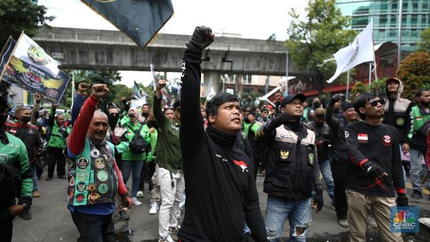 Driver ojek online (ojol) melakukan aksi demonstrasi di kantor pusat Gojek, Jakarta, pada Rabu (18/12/2024). (CNBC Indonesia/Tri Susilo)