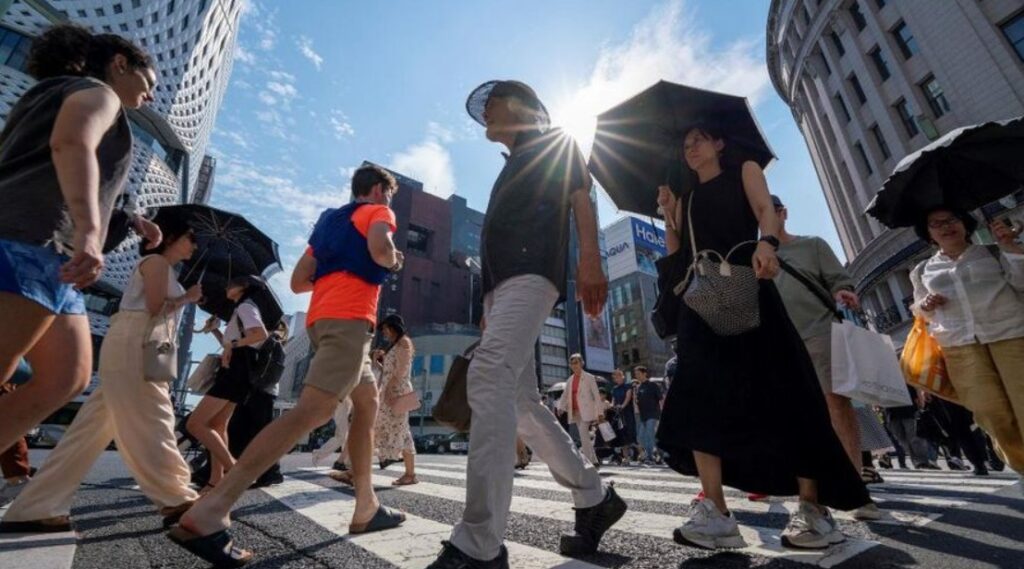 Pejalan kaki berjalan di persimpangan di pusat kota Tokyo yang suhunya mencapai 35 derajat Celcius pada 8 Juli 2024. (AFP/KAZUHIRO NOGI)