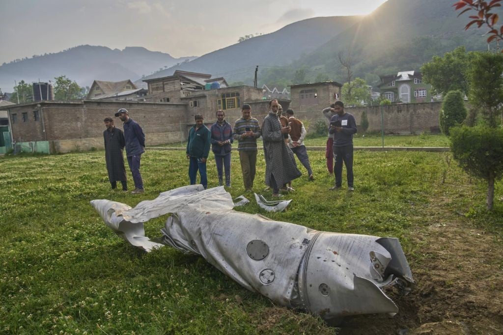 Puing-puing jet tempur India jatuh di permukiman setelah pertempuran udara melawan Pakistan (Foto: AP)
