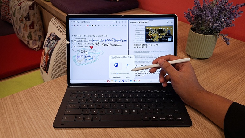 Fitur Samsung DeX juga keren parah! Tablet ini bisa berubah jadi kayak laptop, lengkap sama keyboard cover yang ada tombol Galaxy AI Key-nya. Pencet tombol ini, lo bisa langsung pake asisten AI kayak Gemini atau Bixby buat meeting dadakan atau nyari info penting. Nggak perlu ribet buka aplikasi lain, tinggal lingkari aja teks di layar pake S Pen, fitur Circle to Search with Google langsung nerjemahin. Buat yang sering nyatet, fitur Handwriting Help di Samsung Notes bisa ngerapiin tulisan tangan lo secara otomatis. Mau share catatan ke temen kerja? Gampang banget pake Quick Share! Kata Annisa Maulina, MX Product Marketing Senior Manager Samsung Indonesia, “Galaxy Tab S10 FE adalah partner serba bisa buat generasi muda yang pengen maksimalin setiap kesibukan.” Bener banget kan?