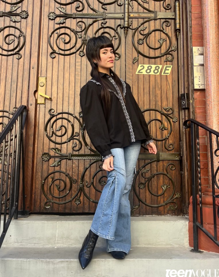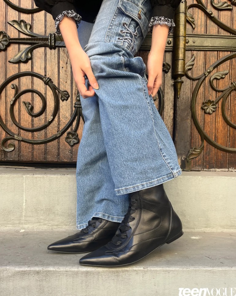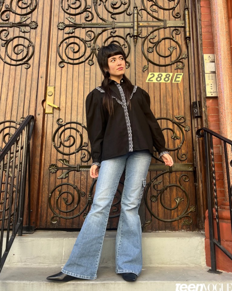Gue mix sama blouse klasik yang punya detail lengan ala era Victoria, terus pakai flare jeans biar seimbang. Boots-nya nongol dikit dari bawah celana — subtle but statement. Ready banget buat ngopi atau duel, tergantung mood.