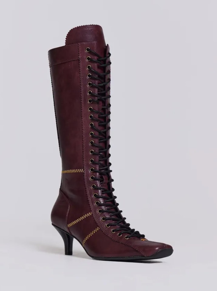 Ini sepatu paling bold dari semuanya. Model knee-high, warna burgundy yang nyala banget, detail metal lawas, jahitan kuning kontras, dan trim zigzag — all in one boot. Sepatunya dapet dua pasang tali, kuning dan hitam. Gue pilih hitam biar balance sama outfit gue yang udah rame.