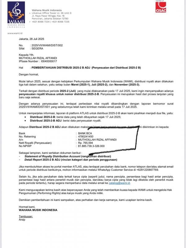 Dalam postingan yang dia unggah, Ari Lasso nunjukin beberapa dokumen penting. Di situ kelihatan jelas banget, ada nama aneh yang kecantum sebagai penerima royalti, yaitu Muthoillah Rizal Affandi. Nah, lho! Padahal, kan, seharusnya itu masuk ke kantong Ari Lasso.