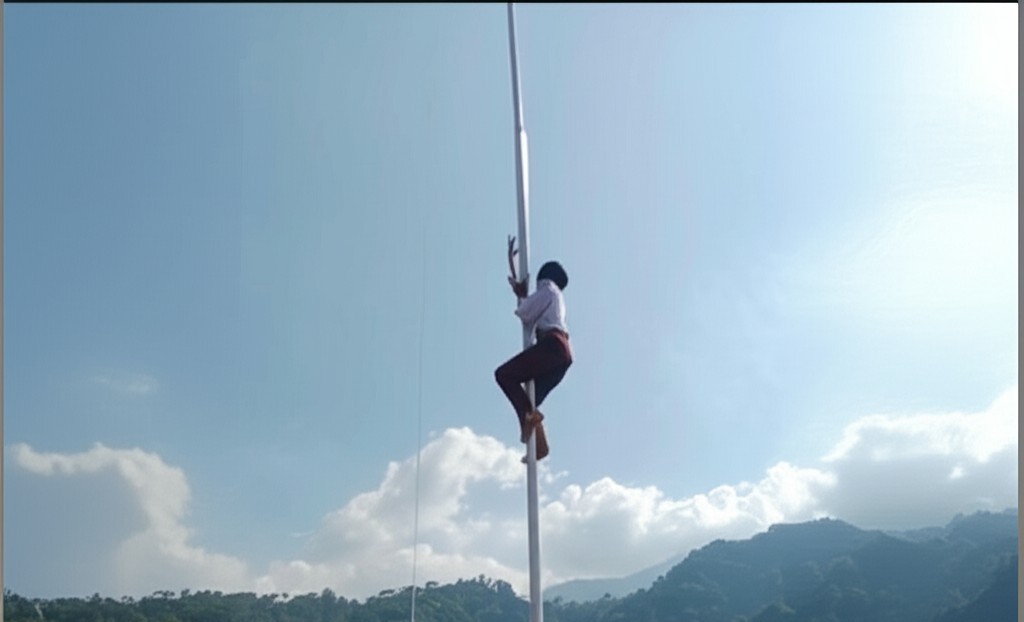 Aksi heroik siswa SD di Lampung Selatan memanjat tiang bendera untuk memasang tali yang terlepas, Minggu (17/8/2025). (photo: iNews)