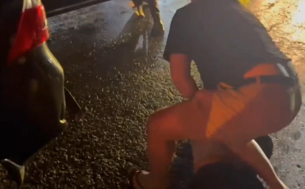 Seketika, suasana jadi tegang. Polisi bersenjata lengkap langsung keluar dan mengepung mobil pelaku. Pintu mobil dibuka paksa, dan dengan suara tegas, polisi langsung ngasih perintah.
