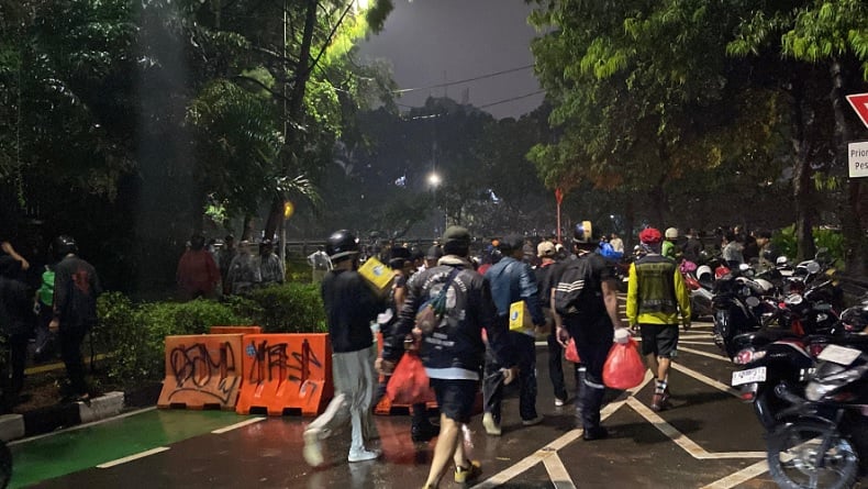 Tapi sekitar pukul 18.40 WIB, hujan mulai reda. Bukannya pulang, massa justru balik lagi ke depan gerbang utama DPR dengan semangat yang nggak luntur meski baju basah. Dari pantauan di lokasi, teriakan “Ayo lanjut! Ayo!” terus menggema dari kerumunan.