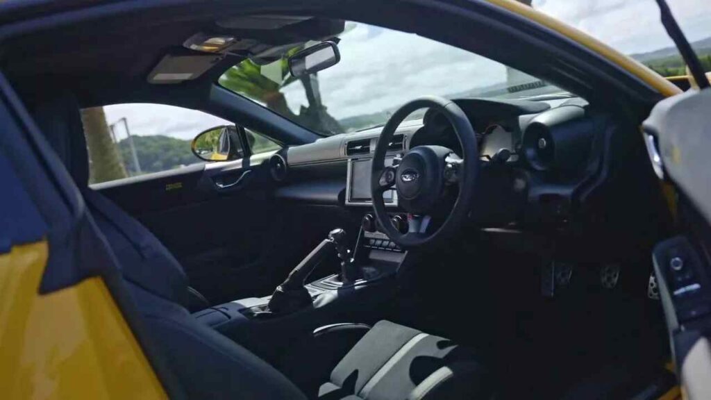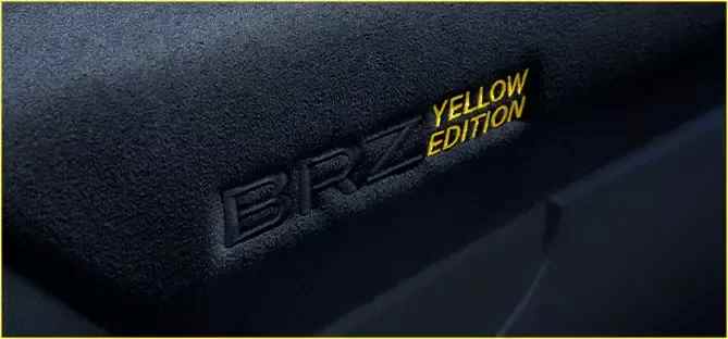 Interior? Kurang lebih mirip Toyota, jahitan kuning di atas material black Ultrasuede + leather trim, plus badge “BRZ Yellow Edition” di pintu.