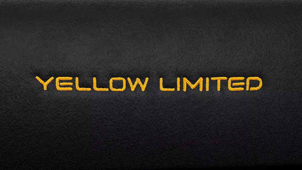 Masuk ke interior, nuansanya konsisten: jok dengan aksen kuning perforated, jahitan kuning di setir, persneling, sama door trim. Ada juga logo kecil “Yellow Limited” di pintu biar makin eksklusif.