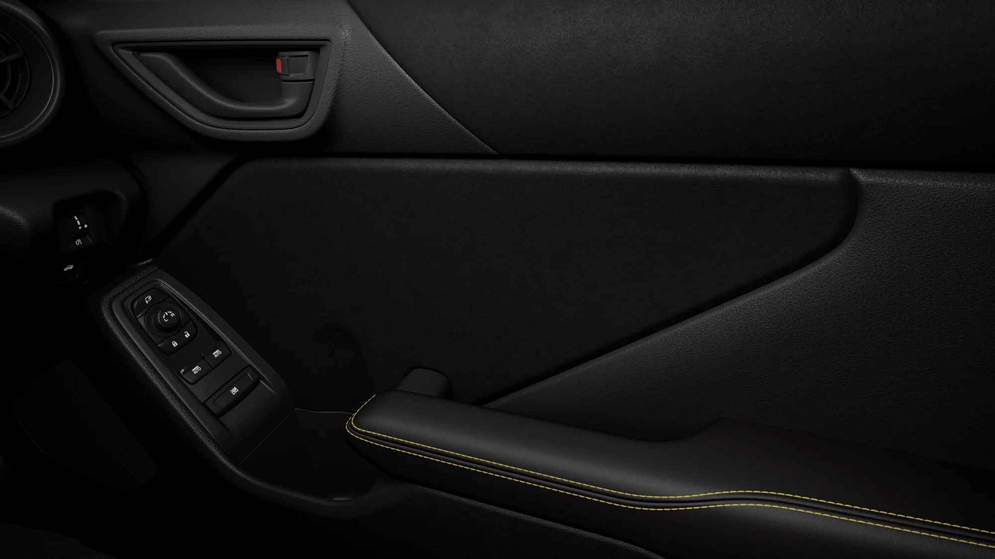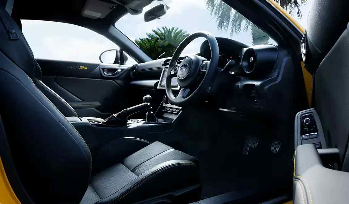 Interior? Kurang lebih mirip Toyota, jahitan kuning di atas material black Ultrasuede + leather trim, plus badge “BRZ Yellow Edition” di pintu.