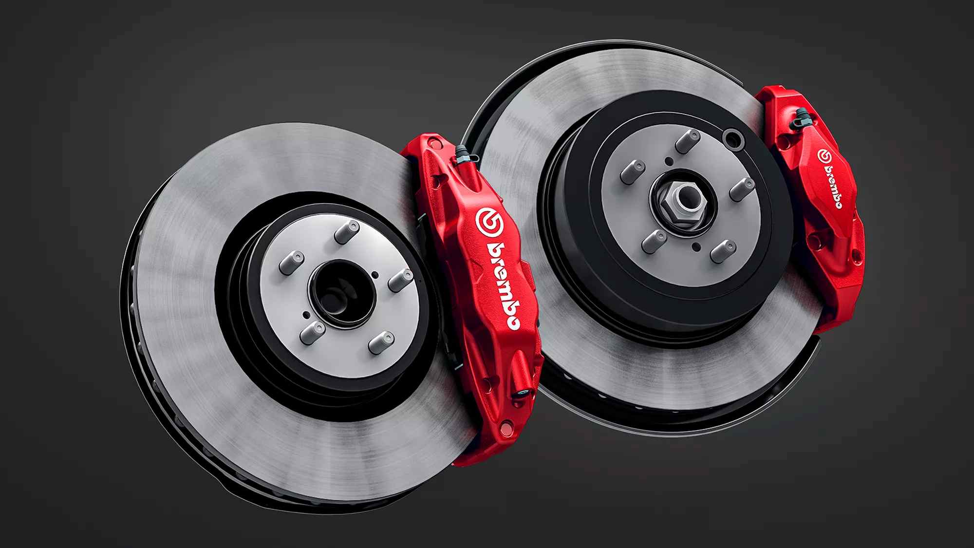 Brembo brakes dengan ventilated disc dan kaliper merah