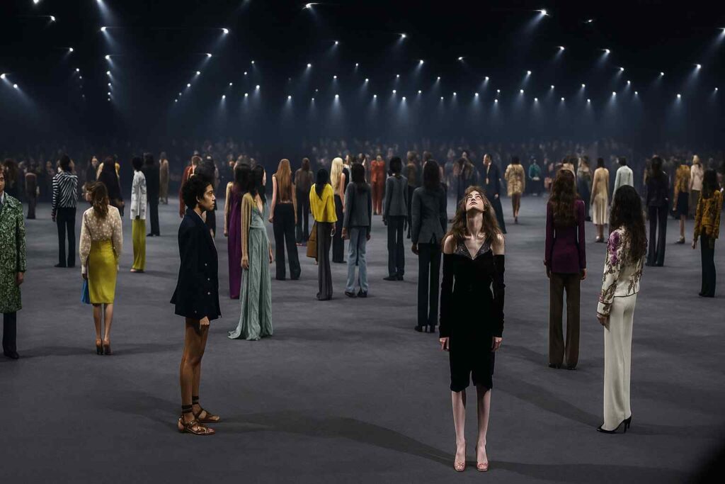 Venue-nya dibuat remang-remang, cuma diterangi lampu yang blink-blink kayak kunang-kunang beneran. Dan the real magic? Cahaya itu enggak datang dari spotlight, tapi dari BUSANA-nya sendiri! Sutra, renda, tulle, dan payet di 80 looks itu memantulkan cahaya kayak sinar-sinar kecil yang Pasolini maksud delapan dekade lalu. Vibes-nya super-poetic.