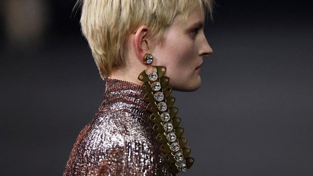Alessandro Michele tidak bisa lepas dari perhiasan. Anting yang menjuntai hingga bahu menunjukkan perhiasan tak hanya soal keindahan tapi juga ketahanan. [REUTERS/Stephane Mahe]